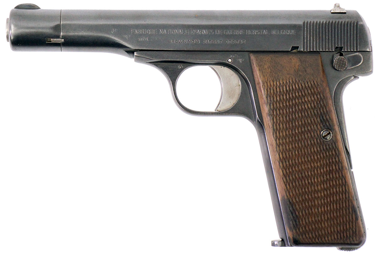 This is a WW2-era FN 1922 pistol chambered in 32 ACP. It features a 4.49-inch barrel, 9-round magazine, thumb safety, grip safety, fixed sights, checkered wood grips, and blued finish. Includes leather holster. Overall, this FN is in good condition with some pitting on the slide and frame. The holster is in fair condition with significant age-related wear, and is missing some hardware. All serial numbers match and there are no import marks. German eagles and Waffenampts are present on the left side of the slide, frame, and on the barrel. This would be a good choice for collecting. Buy online today! - Brand