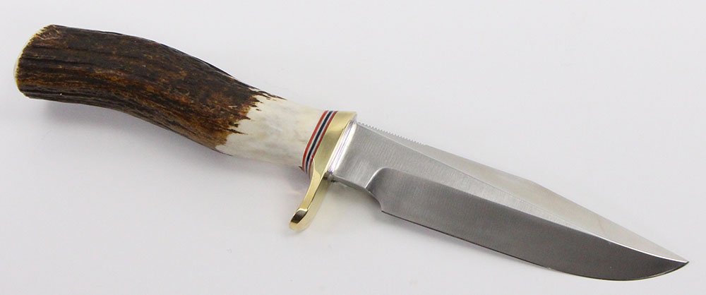 This is a Randall Model 5 Camp and Trail fixed blade knife. It features a 5-inch carbon steel blade, brass guard, and a stag handle. Included with this Randall knife is the factory wrappings, and brown leather sheath. This is a straight-bladed knife preferred by many for all-around camp and trail use. Also, ideal for yachtsmen and sailors for general boating purposes. Among users of this model was Bradford Angier, famed wilderness expert, and author, whose special adaptation is the nickel silver hilt, black Micarta handle, wrist thong, and compass. The late Ross Allen, an internationally known authority on reptiles, also carried a Model #5. Buy online today!