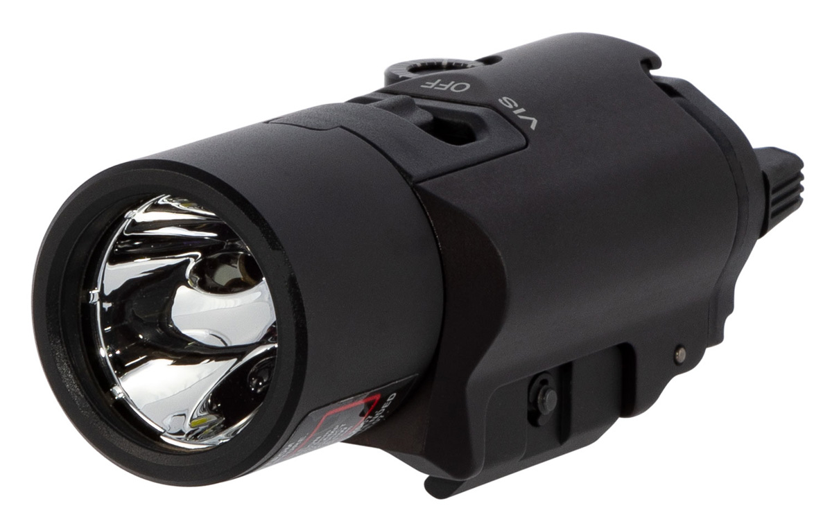 The TLR-VIR II is a lightweight, low-profile, lithium battery powered weapon-mounted tactical illuminator with Integrated IR LED/Laser and visible white LED. It is constructed of aluminum with an anodized finish, polymer switch housing and Borofloat glass lens with anti-reflective coating. It has a momentary and steady on/off switch and a recessed three position mode selector switch. The TLR-VIR II securely fits most pistols and all long guns with MIL-STD-1913 rails.