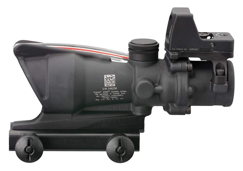 Adapted from the battlefields, US Forces have begun improving this proven Trijicon ACOG scope by adding a small red dot sight on top for close encounter missions. Trijicon has now created a similar model for the public, the TA31-C-100550. The main Trijicon scope provides a dual-illuminated reticle using fiber optics and tritium for bright aiming point in any light condition. The ranging reticle allows for bullet drop compensation out to 600 meters without any manual adjustments. A Trijicon RMR Type 2 sits on top with a 3.25 MOA aiming dot. - Brand